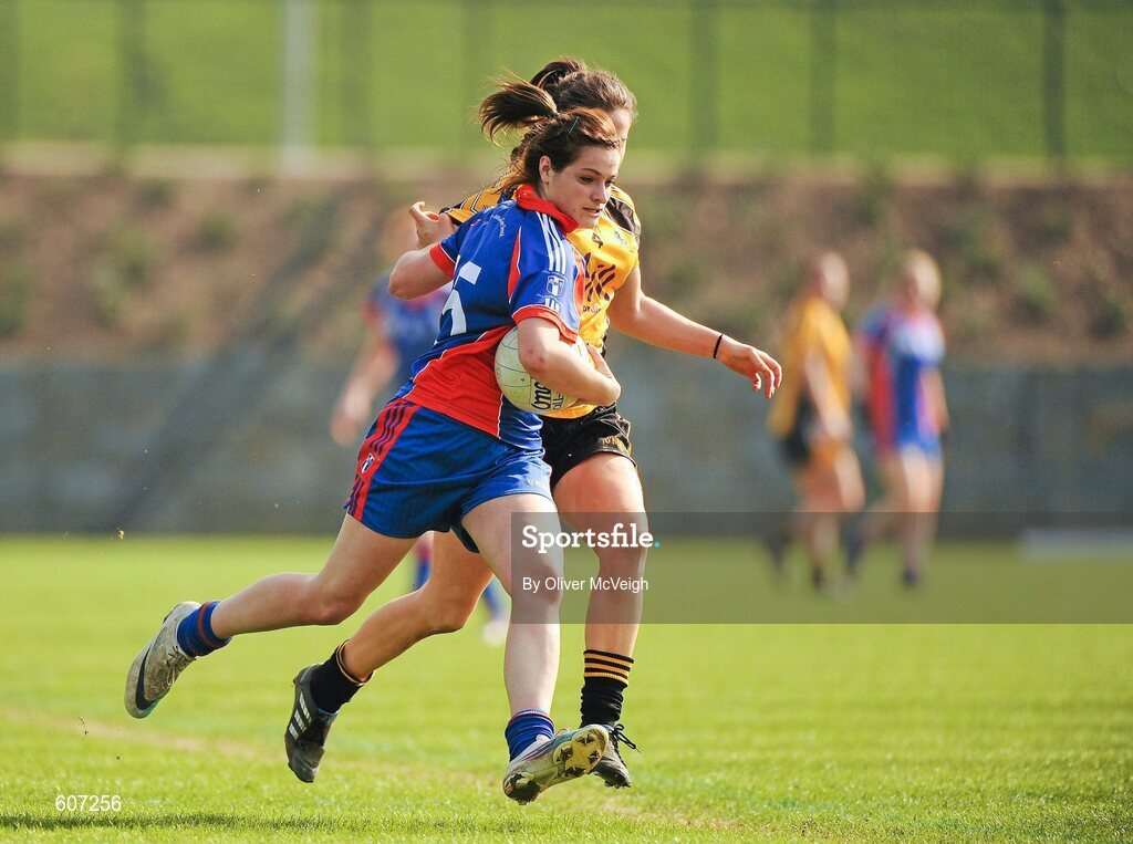 25 March 2012; Sarah Harrington, Mary Immaculate College, in action against Sinead Kenny, NUI Maynooth. Giles Cup Final, Mary Immaculate College Limerick v NUI Maynooth, Queen's University Belfast, University Road, Belfast. Picture credit: Oliver McVeigh / SPORTSFILE