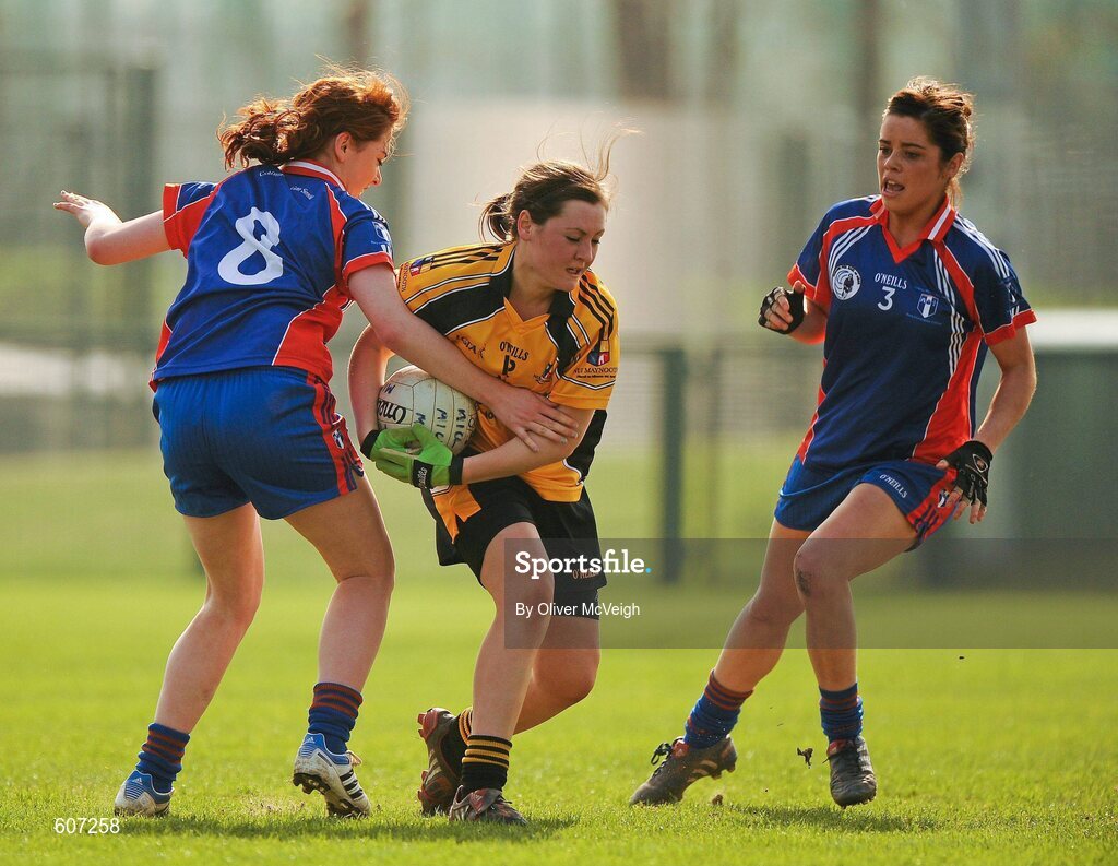 25 March 2012; Debbie Geraghty, NUI Maynooth, in action against Sarah Lynch and Rachel Kenneally, right, Mary Immaculate College. Giles Cup Final, Mary Immaculate College Limerick v NUI Maynooth, Queen's University Belfast, University Road, Belfast. Picture credit: Oliver McVeigh / SPORTSFILE