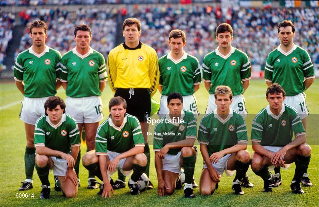 15 June 1988; The Republic of Ireland team, back row, from left, Mick McCarthy, Frank Stapleton, Pat Bonner, Kevin Sheedy, John Aldridge and Tony Galvin, with front row, from left, Ray Houghton, Ronnie Whelan, Chris Hughton, Chris Morris and Kevin Moran prior to the UEFA European Football Championship Finals Group B match between Republic of Ireland and USSR at the Niedersachen Stadium in Hanover, Germany. Photo by Ray McManus/Sportsfile