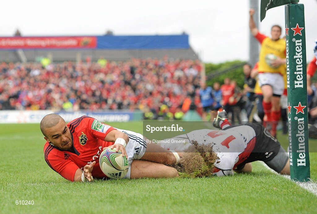 8 April 2012; Simon Zebo, Munster, scores his side's first try despite the efforts of Andrew Trimble, Ulster. Heineken Cup Quarter-Final, Munster v Ulster, Thomond Park, Limerick. Picture credit: Diarmuid Greene / SPORTSFILE
