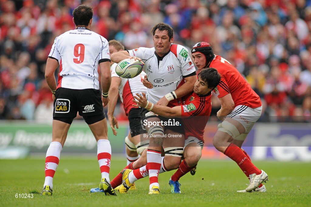 8 April 2012; Pedrie Wannenburg, Ulster, is tackled by Conor Murray, Munster. Heineken Cup Quarter-Final, Munster v Ulster, Thomond Park, Limerick. Picture credit: Diarmuid Greene / SPORTSFILE