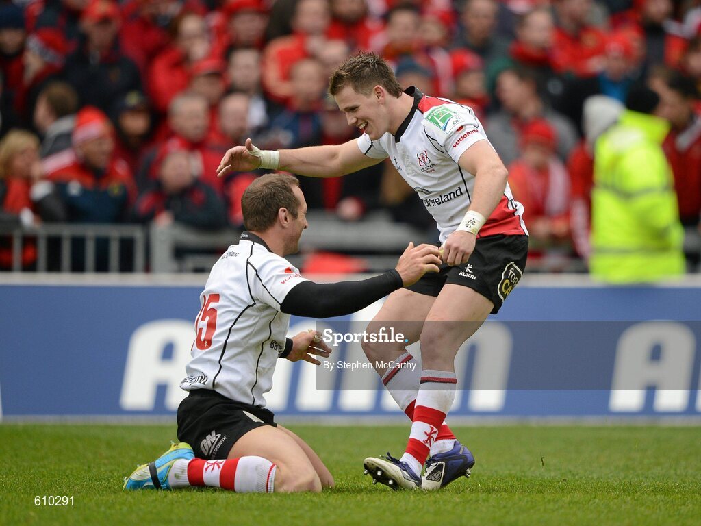 8 April 2012; Stefan Terblanche, left, and Craig Gilroy, Ulster, celebrate their side's victory at the final whistle. Heineken Cup Quarter-Final, Munster v Ulster, Thomond Park, Limerick. Picture credit: Stephen McCarthy / SPORTSFILE