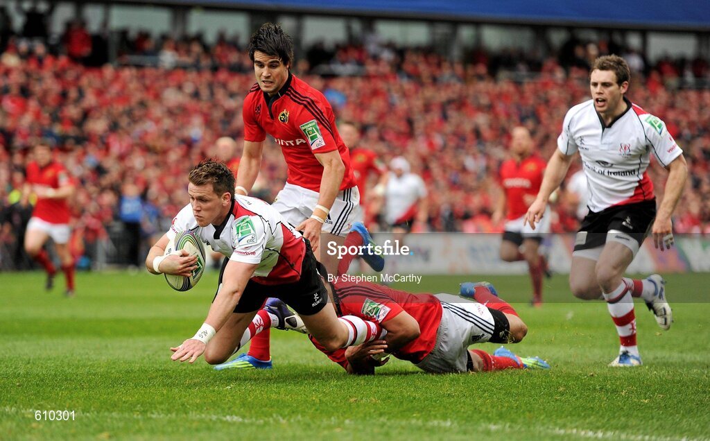 8 April 2012; Craig Gilroy, Ulster, on his way to scoring his side's try despite the tackle of Lifeimi Mafi, Munster. Heineken Cup Quarter-Final, Munster v Ulster, Thomond Park, Limerick. Picture credit: Stephen McCarthy / SPORTSFILE