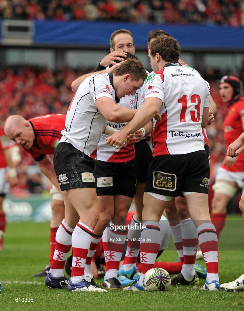 8 April 2012; Ulster players celebrate after Craig Gilroy, left, scored his side's try. Heineken Cup Quarter-Final, Munster v Ulster, Thomond Park, Limerick. Picture credit: Stephen McCarthy / SPORTSFILE
