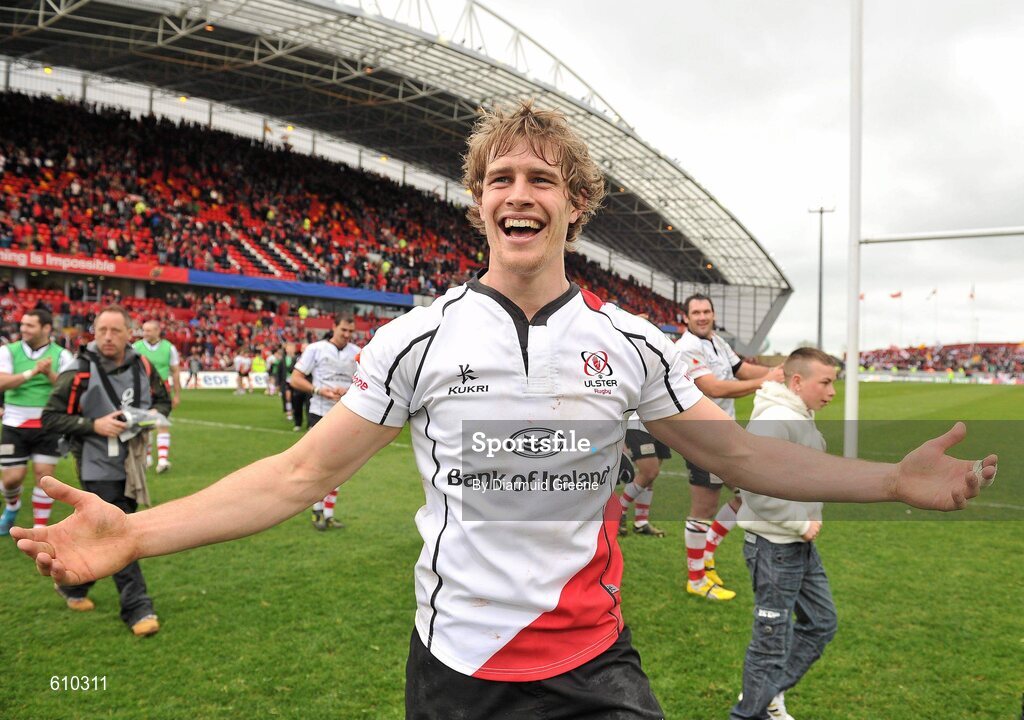 8 April 2012; Ulster's Andrew Trimble celebrates after victory over Munster. Heineken Cup Quarter-Final, Munster v Ulster, Thomond Park, Limerick. Picture credit: Diarmuid Greene / SPORTSFILE