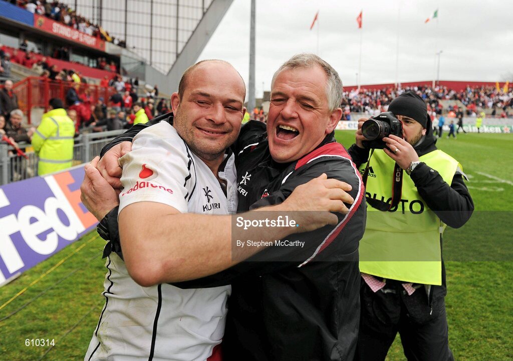 8 April 2012; Ulster head coach Brian McLaughlin celebrates his side's victory with Rory Best. Heineken Cup Quarter-Final, Munster v Ulster, Thomond Park, Limerick. Picture credit: Stephen McCarthy / SPORTSFILE