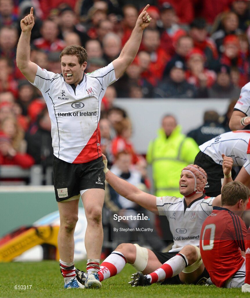 8 April 2012; Darren Cave, left, and Dan Tuohy, Ulster, celebrate at the final whistle. Heineken Cup Quarter-Final, Munster v Ulster, Thomond Park, Limerick. Picture credit: Stephen McCarthy / SPORTSFILE