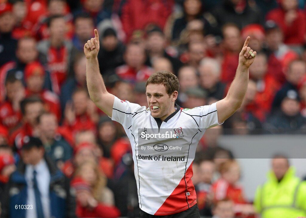 8 April 2012; Darren Cave, Ulster, celebrates at the final whistle. Heineken Cup Quarter-Final, Munster v Ulster, Thomond Park, Limerick. Picture credit: Stephen McCarthy / SPORTSFILE