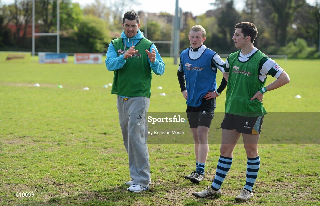 10 April 2012; Leinster and Ireland full-back Rob Kearney directs players, Sean McEntaggert, centre, and Richie O'Brien, from Navan RFC, Co. Meath, during a Kellogg’s Nutri-Grain Professional Rugby Clinic. Navan Rugby Club recently won the opportunity to train with Kellogg’s Nutri-Grain ambassador Rob Kearney and professional IRFU coaches. Kellogg’s Nutri-Grain Professional Rugby Clinic, Old Belvedere RFC, Anglesea Road, Donnybrook, Dublin. Picture credit: Brendan Moran / SPORTSFILE