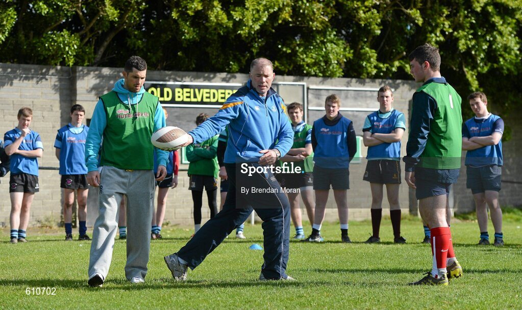 10 April 2012; Leinster and Ireland full-back Rob Kearney and professional coach Colin McEntee with Fergal Cleary, from Navan RFC, Co. Meath, during a Kellogg’s Nutri-Grain Professional Rugby Clinic. Navan Rugby Club recently won the opportunity to train with Kellogg’s Nutri-Grain ambassador Rob Kearney and professional IRFU coaches. Kellogg’s Nutri-Grain Professional Rugby Clinic, Old Belvedere RFC, Anglesea Road, Donnybrook, Dublin. Picture credit: Brendan Moran / SPORTSFILE