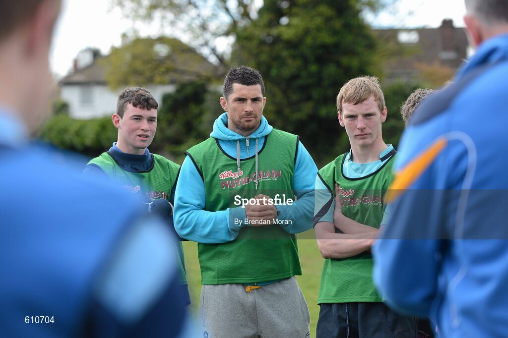 10 April 2012; Leinster and Ireland full-back Rob Kearney with players Fergal Cleary, left, and Adam Keating, from Navan RFC, Co. Meath, as they listen to professional coach Colin McEntee during a Kellogg’s Nutri-Grain Professional Rugby Clinic. Navan Rugby Club recently won the opportunity to train with Kellogg’s Nutri-Grain ambassador Rob Kearney and professional IRFU coaches. Kellogg’s Nutri-Grain Professional Rugby Clinic, Old Belvedere RFC, Anglesea Road, Donnybrook, Dublin. Picture credit: Brendan Moran / SPORTSFILE