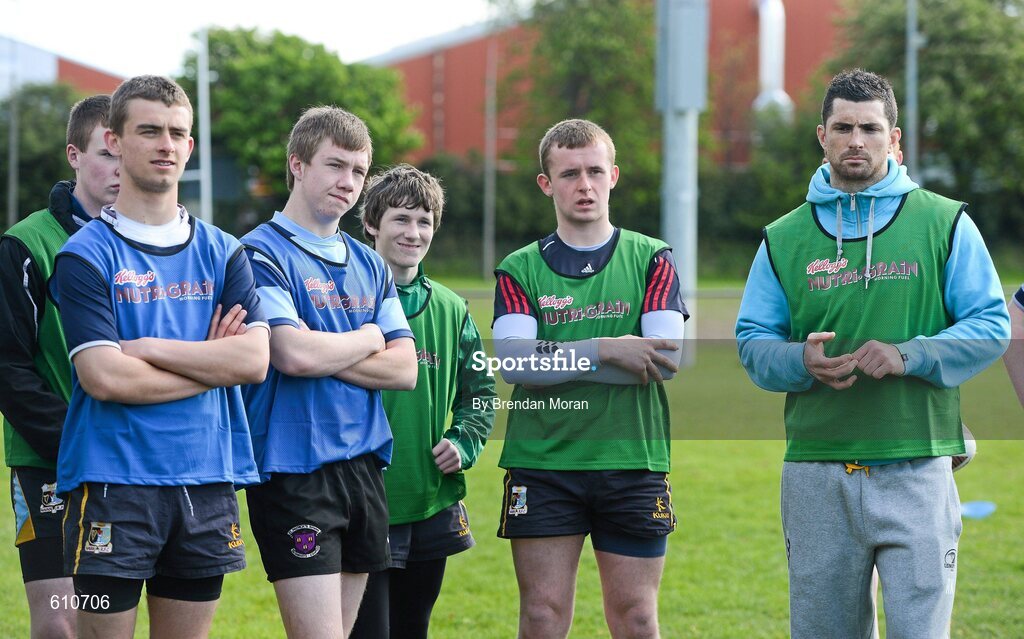 10 April 2012; Leinster and Ireland full-back Rob Kearney with players, from left, Mark O'Meara, Jack Condie, Graham Garland and Harry Keane, from Navan RFC, Co. Meath, as they listen to professional coach Colin McEntee during a Kellogg’s Nutri-Grain Professional Rugby Clinic. Navan Rugby Club recently won the opportunity to train with Kellogg’s Nutri-Grain ambassador Rob Kearney and professional IRFU coaches. Kellogg’s Nutri-Grain Professional Rugby Clinic, Old Belvedere RFC, Anglesea Road, Donnybrook, Dublin. Picture credit: Brendan Moran / SPORTSFILE