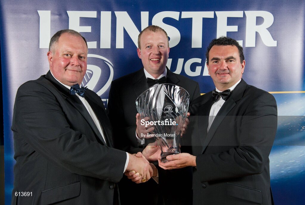 21 April 2012; Prinicpal Tim Kelleher, right, St Michael's College, Ballsbridge, Dublin, receives the Powerade School of the Year award from John Coffey, centre, Powerade and Stuart Bayley, President, Leinster Branch. Leinster Rugby Awards Ball, Mansion House, Dawson St, Dublin. Picture credit: Brendan Moran / SPORTSFILE