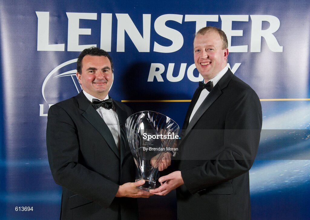 21 April 2012; Prinicpal Tim Kelleher, St Michael's College, Ballsbridge, Dublin, receives the Powerade School of the Year award by from John Coffey, Powerade. Leinster Rugby Awards Ball, Mansion House, Dawson St, Dublin. Picture credit: Brendan Moran / SPORTSFILE