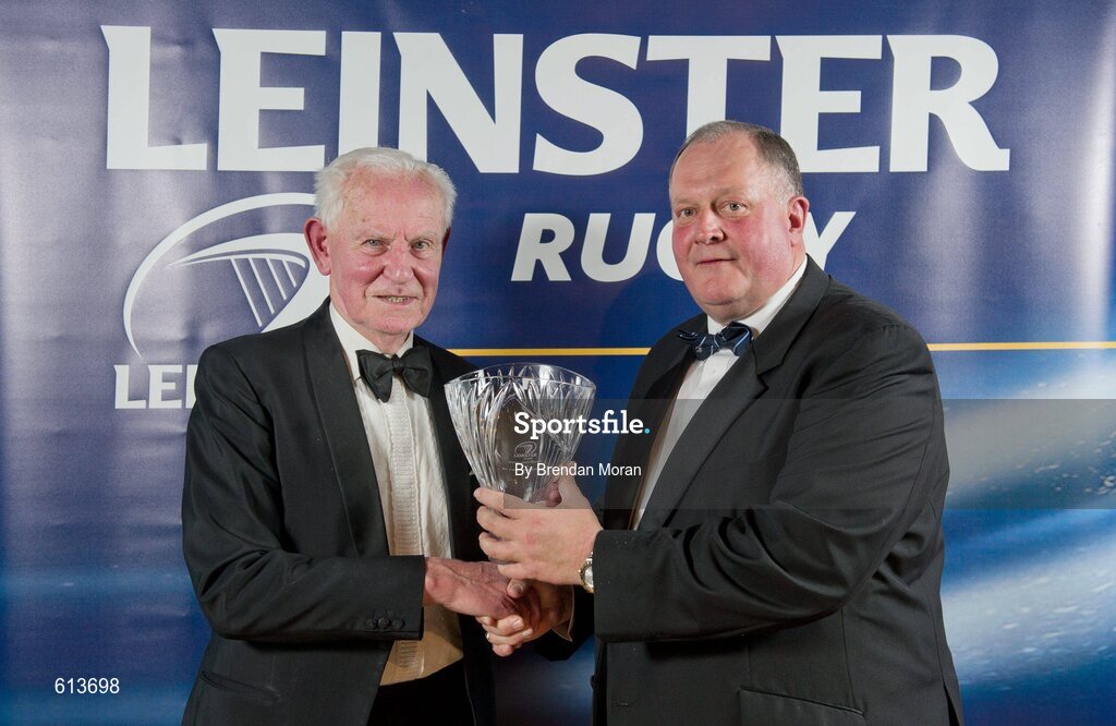 21 April 2012; Kevin Kelleher, from St Conleth's College, is presented with Special Merit School award by Stuart Bayley, right, President, Leinster Branch. Leinster Rugby Awards Ball, Mansion House, Dawson St, Dublin. Picture credit: Brendan Moran / SPORTSFILE