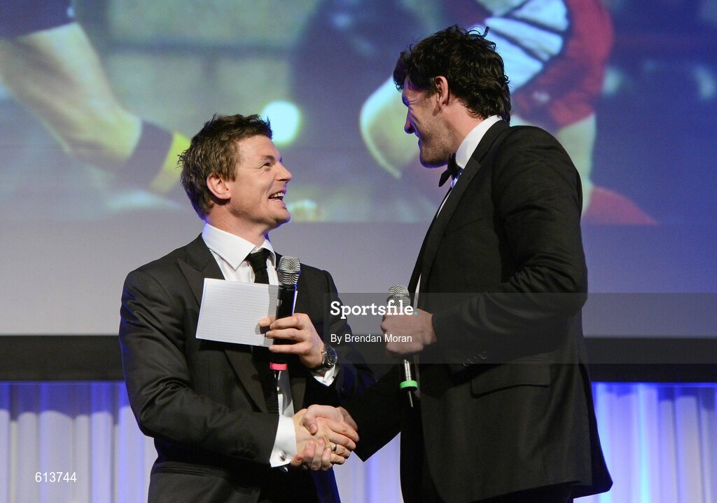 21 April 2012; Leinster's Brian O'Driscoll speaking with team-mate Shane Horgan on the occasion of his retirement from the game this season. Leinster Rugby Awards Ball, Mansion House, Dawson St, Dublin. Picture credit: Brendan Moran / SPORTSFILE