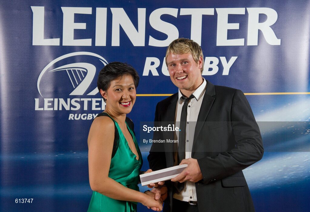 21 April 2012; Leinster's Fionn Carr is presented with the Wagamama Noodler of the Year award by Christine Chung, Operations Manager, Wagamama. Leinster Rugby Awards Ball, Mansion House, Dawson St, Dublin. Picture credit: Brendan Moran / SPORTSFILE