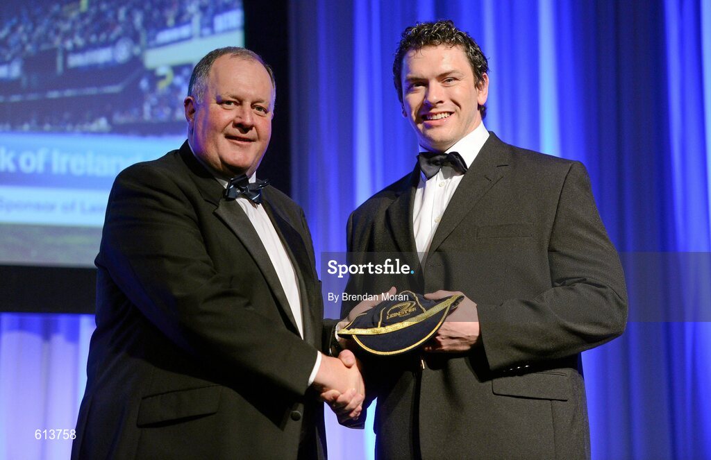 21 April 2012; Stuart Bayley, President of the Leinster Branch, presents a cap to Leinster's Simon Shawe. Leinster Rugby Awards Ball, Mansion House, Dawson St, Dublin. Picture credit: Brendan Moran / SPORTSFILE