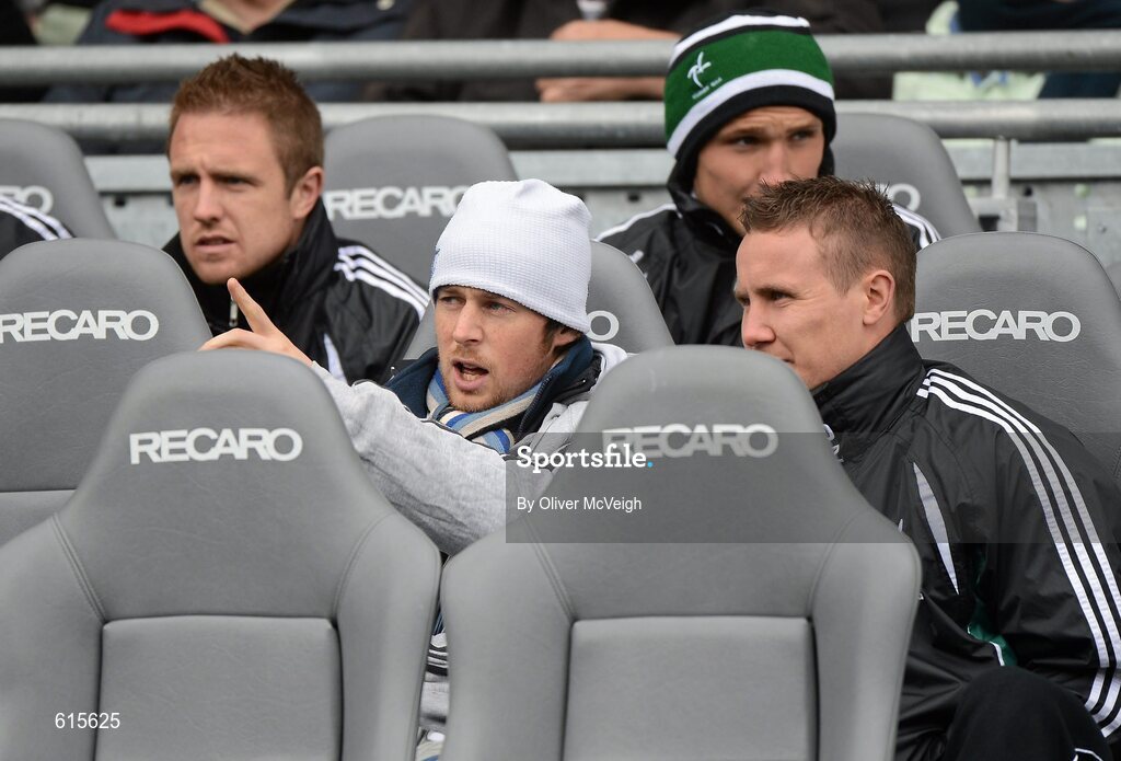 29 April 2012; Cavan footballer Sean Johnston, centre, with Kildare's Brian Flanagan, right, sitting on the Kildare substitutes bench during the game. Allianz Football League, Division 2 Final, Tyrone v Kildare, Croke Park, Dublin. Picture credit: Oliver McVeigh / SPORTSFILE