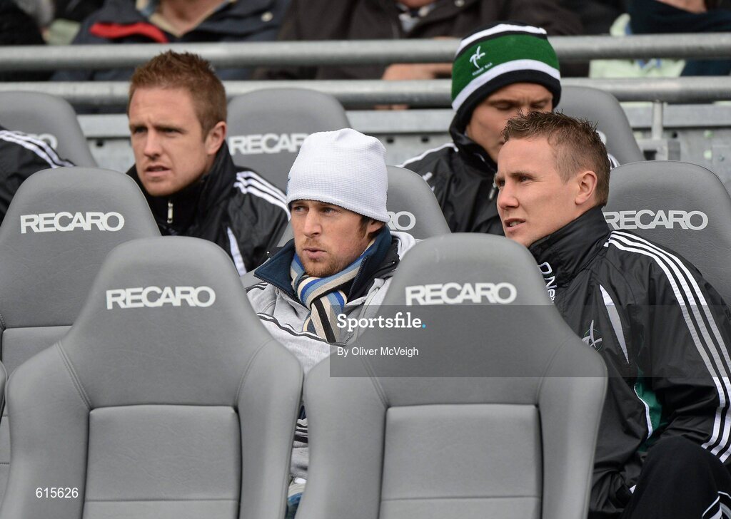 29 April 2012; Cavan footballer Sean Johnston, centre, with Kildare's Brian Flanagan, right, sitting on the Kildare substitutes bench during the game. Allianz Football League, Division 2 Final, Tyrone v Kildare, Croke Park, Dublin. Picture credit: Oliver McVeigh / SPORTSFILE