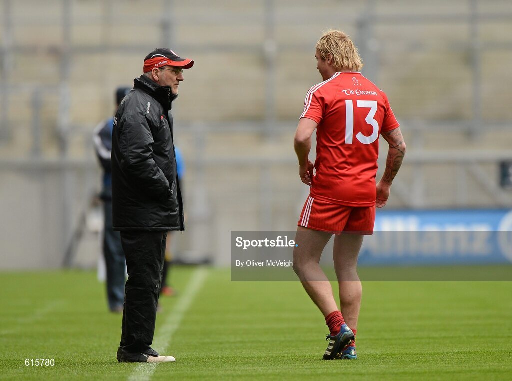 29 April 2012; Tyrone manager Mickey Harte in conversation with Owen Mulligan during the game. Allianz Football League, Division 2 Final, Tyrone v Kildare, Croke Park, Dublin. Picture credit: Oliver McVeigh / SPORTSFILE