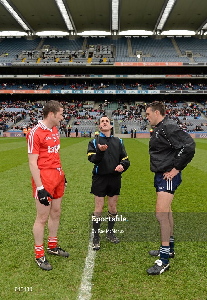 29 April 2012; Referee David Coldrick, centre, tosses the coin between Tyrone captain Stephen O'Neill, left, and Kildare captain John Doyle. Allianz Football League, Division 2 Final, Tyrone v Kildare, Croke Park, Dublin. Picture credit: Ray McManus / SPORTSFILE