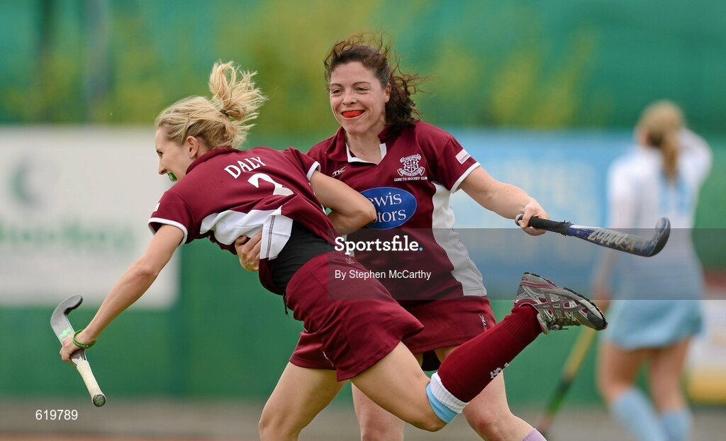 13 May 2012; Nicci Daly, Loreto, celebrates with team-mate Cathy McKean, right, after scoirng her side's second goal. Electric Ireland Women's Irish Senior Cup Final, UCD v Loreto, National Hockey Stadium, UCD, Belfield, Dublin. Picture credit: Stephen McCarthy / SPORTSFILE