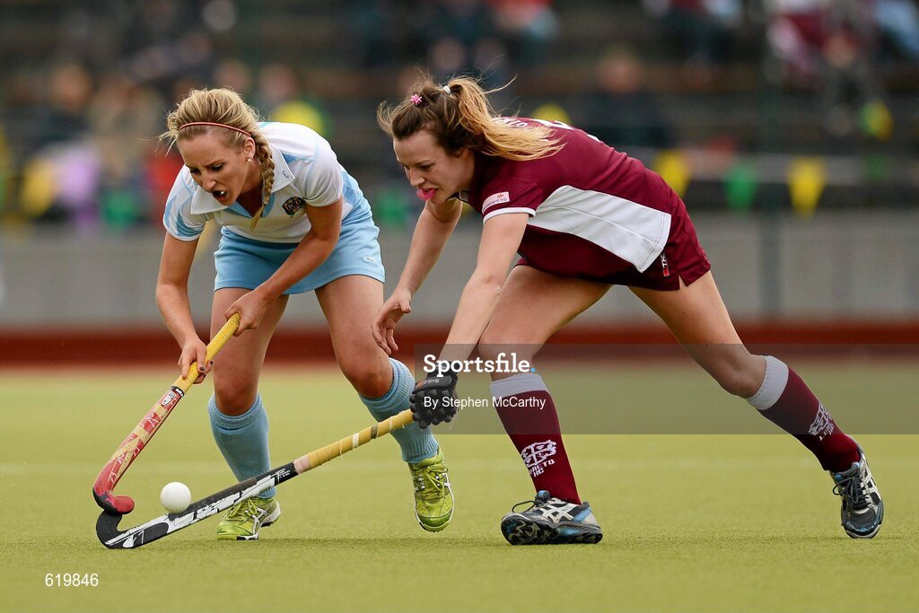 13 May 2012; Rachel O'Reilly, UCD, in action against Sinead McGirr, Loreto. Electric Ireland Women's Irish Senior Cup Final, UCD v Loreto, National Hockey Stadium, UCD, Belfield, Dublin. Picture credit: Stephen McCarthy / SPORTSFILE
