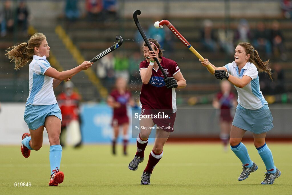13 May 2012; Niamh Small, Loreto, in action against Sarah Greene, right, and Chloe Watkins, UCD. Electric Ireland Women's Irish Senior Cup Final, UCD v Loreto, National Hockey Stadium, UCD, Belfield, Dublin. Picture credit: Stephen McCarthy / SPORTSFILE