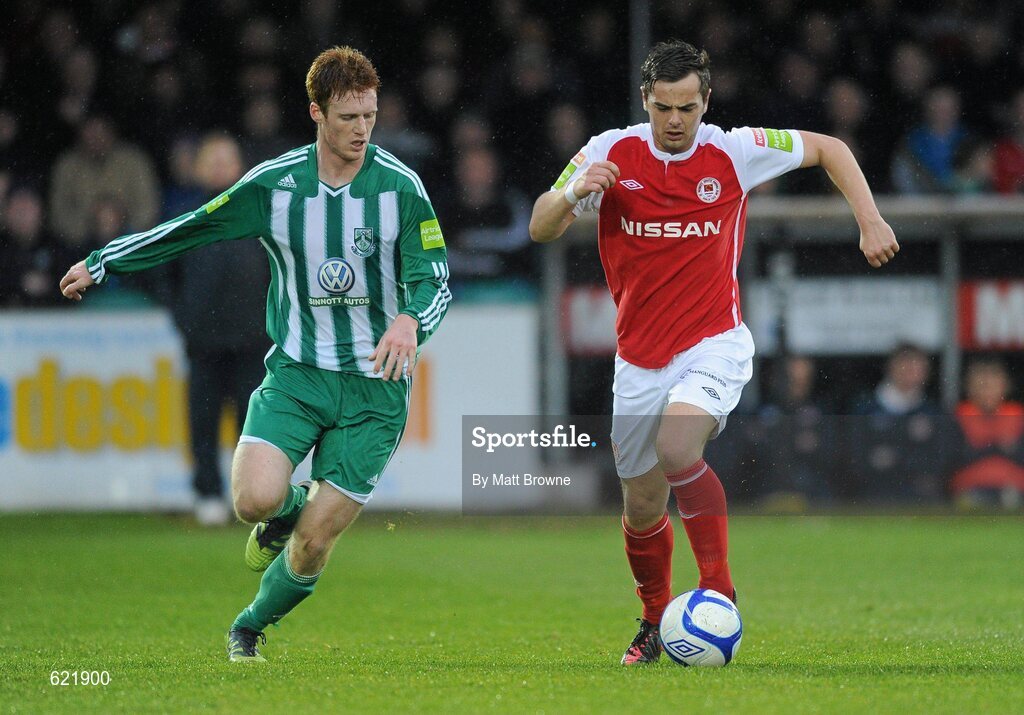 18 May 2012; Greg Bolger, Bray Wanderers, in action against Sean Houston, St Patrick's Athletic. Airtricity League Premier Division, Bray Wanderers v St Patrick's Athletic, Carlisle Grounds, Bray, Co. Wicklow. Picture credit: Matt Browne / SPORTSFILE