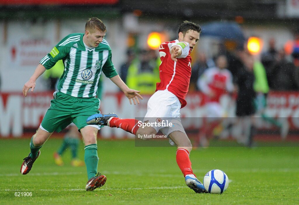 18 May 2012; John Russell, St Patrick's Athletic, in action against Adam Hanlon, Bray Wanderers. Airtricity League Premier Division, Bray Wanderers v St Patrick's Athletic, Carlisle Grounds, Bray, Co. Wicklow. Picture credit: Matt Browne / SPORTSFILE