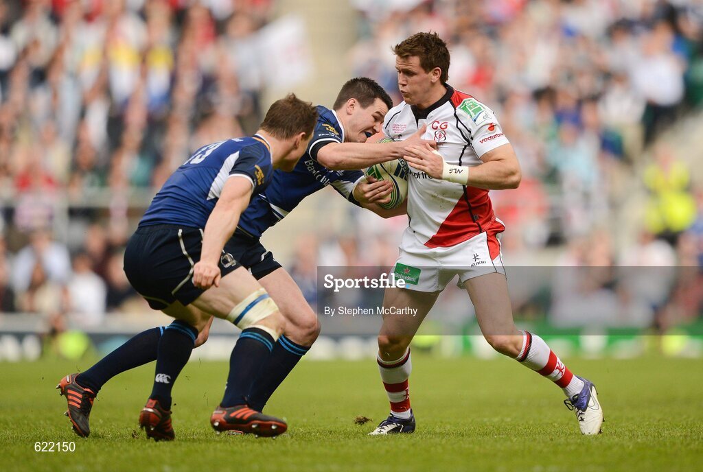 19 May 2012; Craig Gilroy, Ulster, is tackled by Jonathan Sexton and Brian O'Driscoll, left, Leinster. Heineken Cup Final, Leinster v Ulster, Twickenham Stadium, Twickenham, England. Picture credit: Stephen McCarthy / SPORTSFILE
