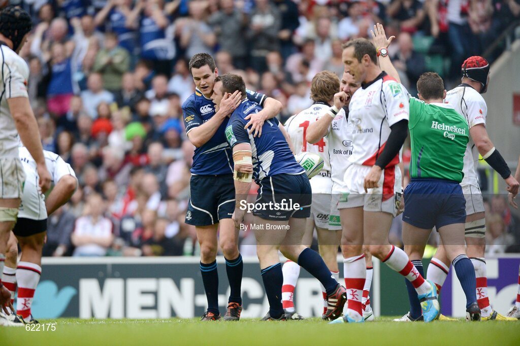 19 May 2012; Cian Healy, Leinster, is congratulated by team-mate Jonathan Sexton after he scored the second try against Ulster. Heineken Cup Final, Leinster v Ulster, Twickenham Stadium, Twickenham, England. Picture credit: Matt Browne / SPORTSFILE