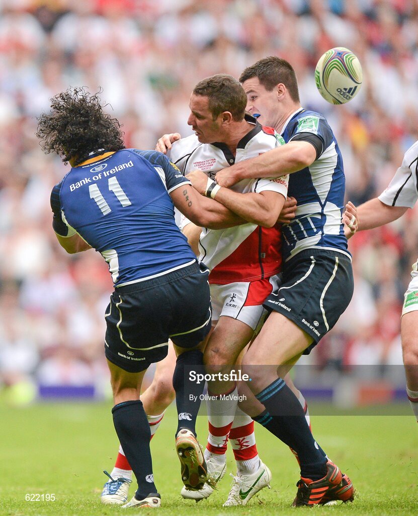 19 May 2012; Paddy Wallace, Ulster, is tackled by Isa Nacewa and Jonathan Sexton, right, Leinster. Heineken Cup Final, Leinster v Ulster, Twickenham Stadium, Twickenham, England. Picture credit: Oliver McVeigh / SPORTSFILE