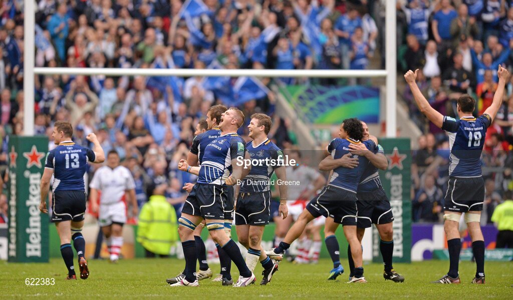 19 May 2012; Leinster players celebrate at the final whistle after victory over Ulster. Heineken Cup Final, Leinster v Ulster, Twickenham Stadium, Twickenham, England. Picture credit: Diarmuid Greene / SPORTSFILE