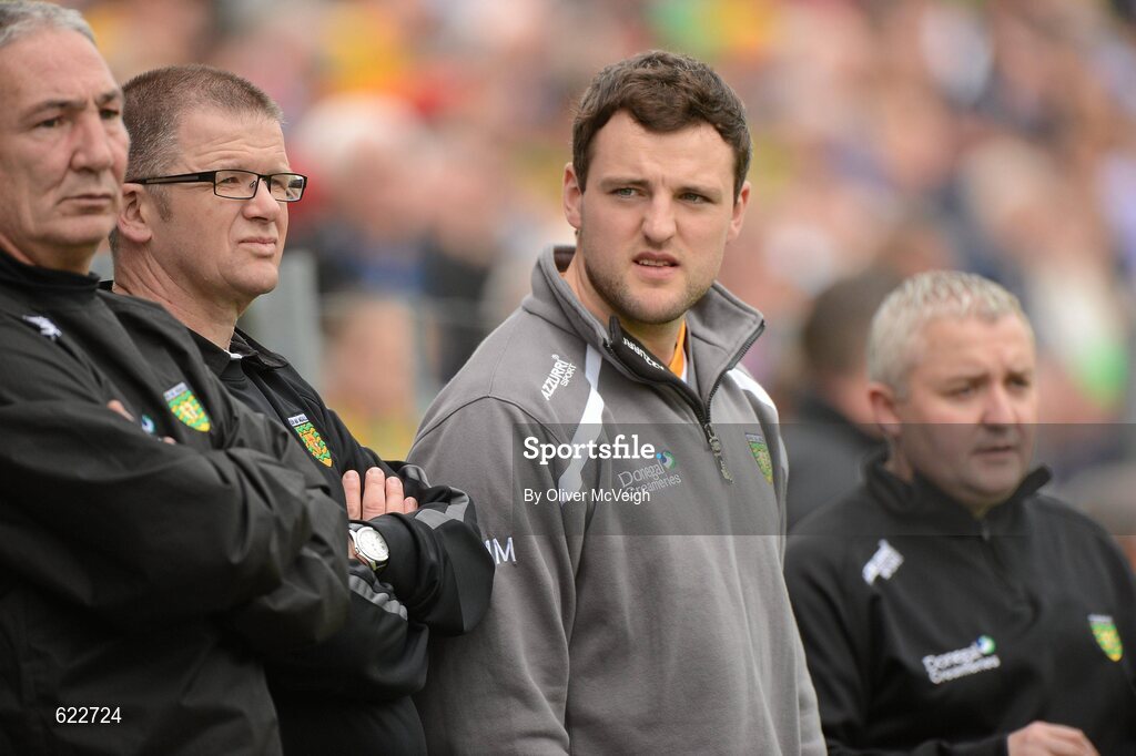 20 May 2012; Injured Donegal captain Michael Murphy, watching the game from the team dug out. Ulster GAA Football Senior Championship Preliminary Round, Cavan v Donegal, Kingspan Breffni Park, Cavan. Picture credit: Oliver McVeigh / SPORTSFILE