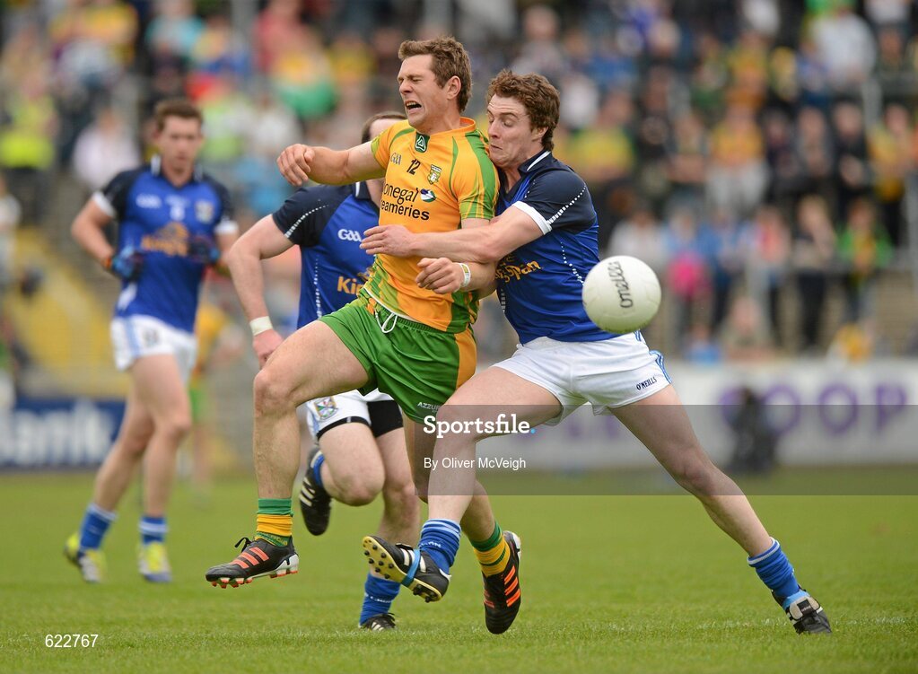 20 May 2012; Ryan Bradley, Donegal, in action against Damien Reilly, Cavan. Ulster GAA Football Senior Championship Preliminary Round, Cavan v Donegal, Kingspan Breffni Park, Cavan. Picture credit: Oliver McVeigh / SPORTSFILE