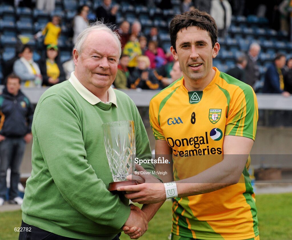 20 May 2012; Rory Kavanagh receives a special presention for his 100th appearance for Donegal from Donegal Chairman PJ McGowan after the game. Ulster GAA Football Senior Championship Preliminary Round, Cavan v Donegal, Kingspan Breffni Park, Cavan. Picture credit: Oliver McVeigh / SPORTSFILE