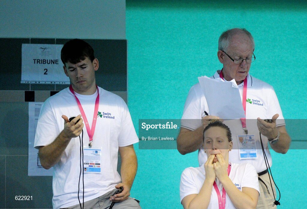 21 May 2012; Swim Ireland head coach Ronald Claes, left, and Swim Ireland National Performance Director Peter Banks, check their stop watches, as swimmer Bethany Carson, from Lisburn, Co. Antrim, cheers on Melanie Nocher, from Hollywood, Co. Down, during Heat 3 of the Women's 200m Backstroke. Nocher finished her heat in a time of 2:13.09, a time which sees her finish as 8th fastest qualifier for the Semi-Finals of this event. 31st LEN European Swimming Championships 2012, Morning Session, Debrecen Sportcentrum, Debrecen, Hungary. Picture credit: Brian Lawless / SPORTSFILE
