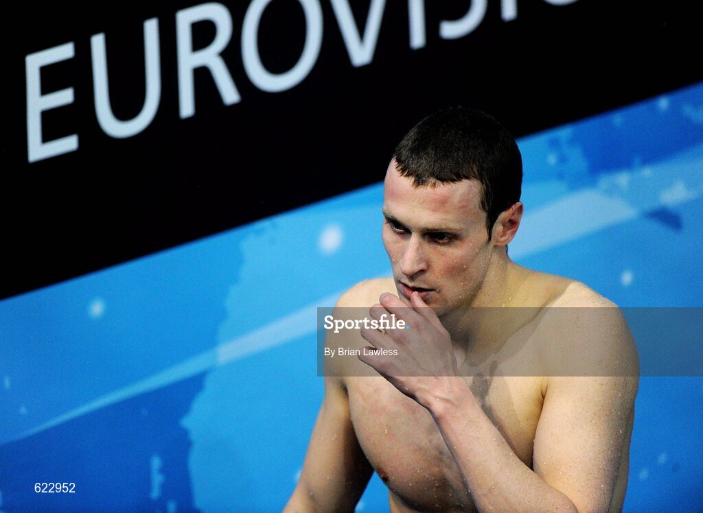 21 May 2012; Ireland's Karl Burdis, from Donaghmede, Dublin, after Heat 5 of the Men's 100m Backstroke. Burdis finished his heat in a time of 56.43. 31st LEN European Swimming Championships 2012, Morning Session, Debrecen Sportcentrum, Debrecen, Hungary. Picture credit: Brian Lawless / SPORTSFILE