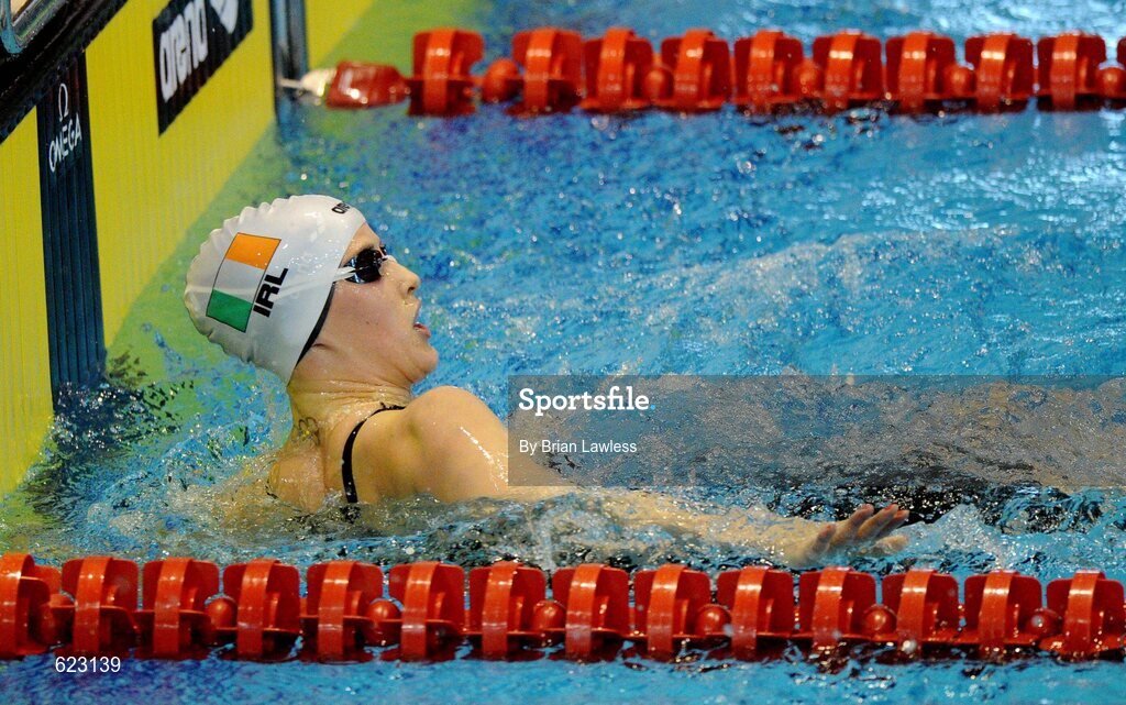 21 May 2012; Ireland's Melanie Nocher, from Hollywood, Co. Down, turns to check her time after Semi-Final 1 of the Women's 200m Backstroke. Nocher finished in a time of 2:11.68 to qualify for the final in 6th position. The final will take place during the evening session on Tuesday. 31st LEN European Swimming Championships 2012, Women's 200m Backstroke Semi-Final, Evening Session, Debrecen Sportcentrum, Debrecen, Hungary. Picture credit: Brian Lawless / SPORTSFILE