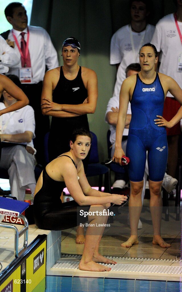 21 May 2012; Ireland's Melanie Nocher, from Hollywood, Co. Down, bottom, watches the competitors in Semi-Final 2 after finishing Semi-Final 1 of the Women's 200m Backstroke. Nocher finished in a time of 2:11.68 to qualify for the final in 6th position. The final will take place during the evening session on Tuesday. 31st LEN European Swimming Championships 2012, Women's 200m Backstroke Semi-Final, Evening Session, Debrecen Sportcentrum, Debrecen, Hungary. Picture credit: Brian Lawless / SPORTSFILE