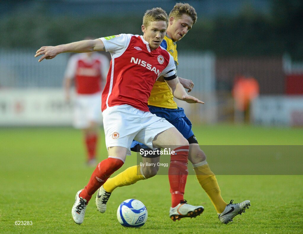 21 May 2012; Connor Kenna, St Patrick's Athletic, in action against Mark Griffin, Dundalk FC. Airtricity League Premier Division, St Patrick's Athletic v Dundalk FC, Richmond Park, Dublin. Picture credit: Barry Cregg / SPORTSFILE