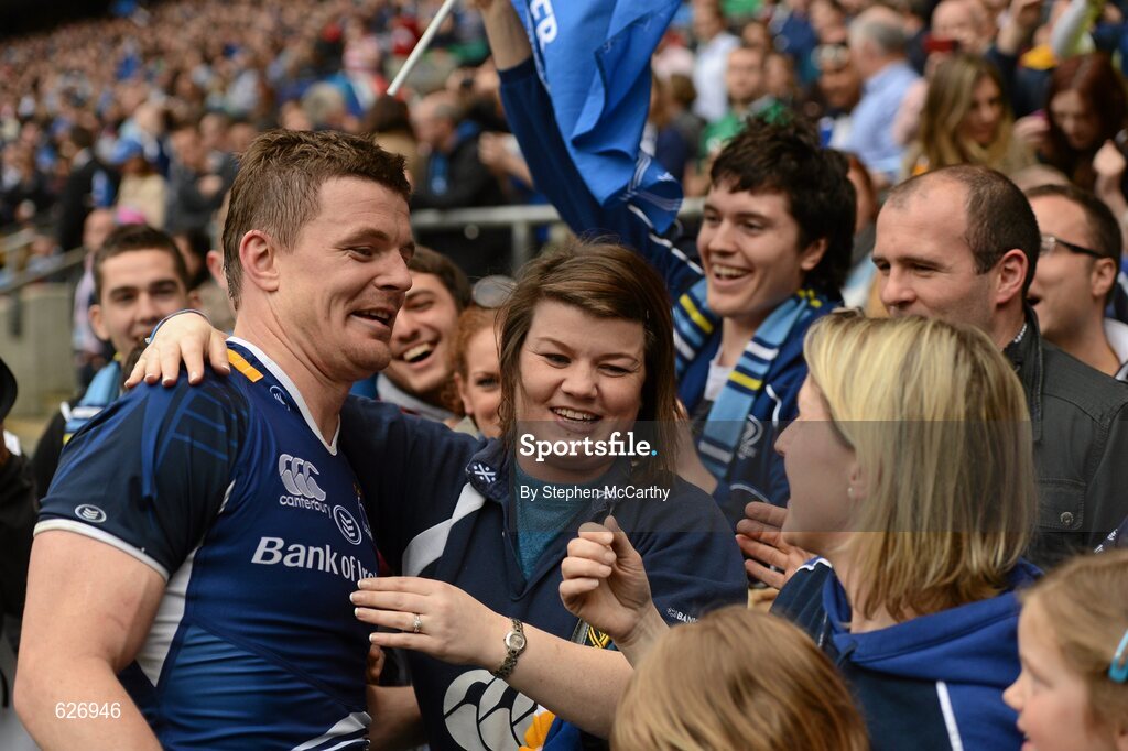 19 May 2012; Brian O'Driscoll, Leinster, is congratulated by his sisters Susan, centre, and Julie, right, following his side's victory. Heineken Cup Final, Leinster v Ulster, Twickenham Stadium, Twickenham, England. Picture credit: Stephen McCarthy / SPORTSFILE