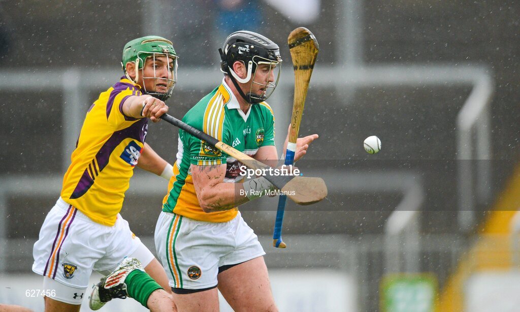 2 June 2012; Shane Dooley shoots under pressure from Wexford full back Keith Rossiter to score the opening goal of the game for Offaly. Leinster GAA Hurling Senior Championship Quarter-Final, Offaly v Wexford, O'Connor Park, Tullamore, Co. Offaly. Picture credit: Ray McManus / SPORTSFILE