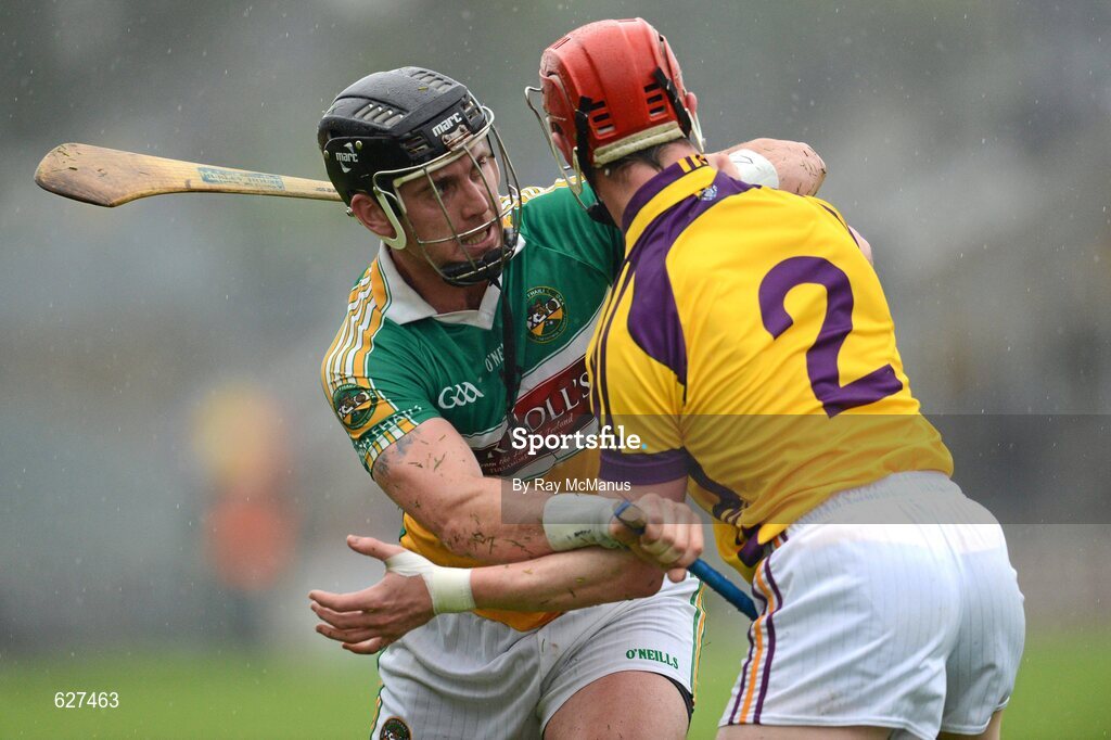 2 June 2012; Offaly's Shane Dooley,left, and Wexford corner back Willie Deveraux jostle during the first half. Leinster GAA Hurling Senior Championship Quarter-Final, Offaly v Wexford, O'Connor Park, Tullamore, Co. Offaly. Picture credit: Ray McManus / SPORTSFILE
