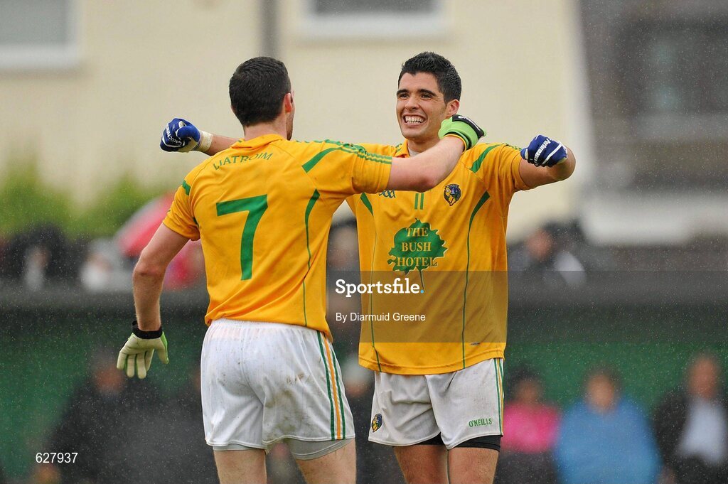 3 June 2012; Emlyn Mulligan, right, and Wayne McKeon, Leitrim, celebrate at the final whistle after victory over London. Connacht GAA Football Senior Championship Quarter-Final, London v Leitrim, Emerald Park, Ruislip, London. Picture credit: Diarmuid Greene / SPORTSFILE