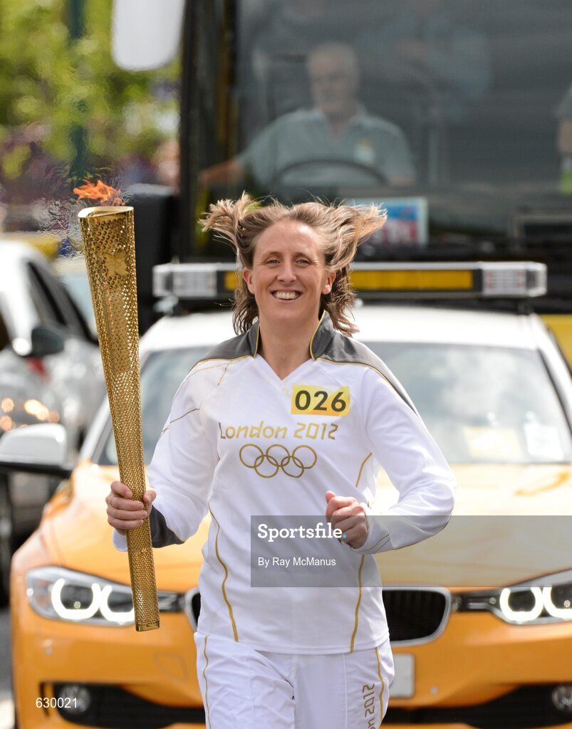6 June 2012; Gillian Garrett, from Newtownmountkennedy, Co. Wicklow, is a hockey player, coach and umpire in her community where she has set up a hockey club that now involves more than 150 children. She has represented Ireland in hockey at club, provincial and under-21 levels, with the Olympic Flame during the London 2012 Olympic Torch Relay through the streets of Dublin. Grove Road, Dublin. Picture credit: Ray McManus / SPORTSFILE