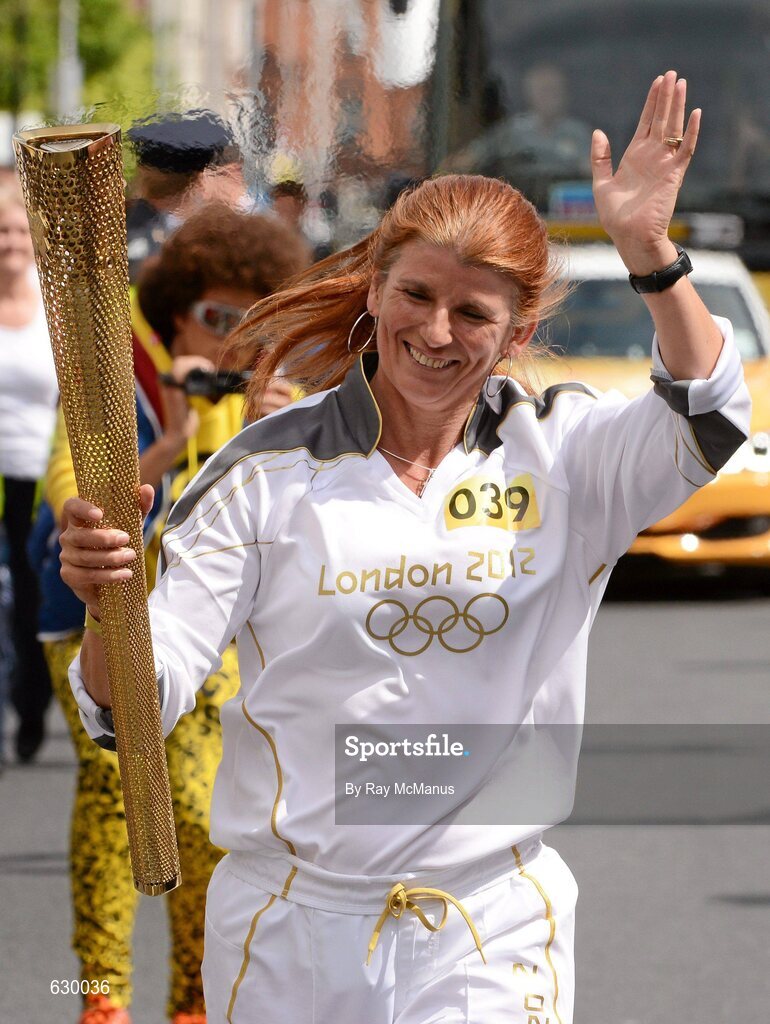 6 June 2012; Torchbearer Bridget Taylor, from Bray, Co. Wicklow, is representing her four times world boxing champion and Olympian daughter Katie Taylor. Bridget was one of Ireland’s first ever women’s boxing referees and judges and, with husband Peter, has been vital to Katie’s incredible sporting success to date, with the Olympic Flame during the London 2012 Olympic Torch Relay through the streets of Dublin. Merrion Square West, Dublin. Picture credit: Ray McManus / SPORTSFILE