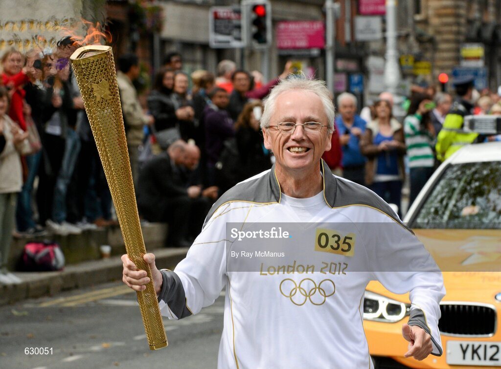6 June 2012; Torchbearer John Treacy, from Villierstown, Co. Waterford, is a silver medal winner from the 1984 Los Angeles Olympic Games. A legendary figure in Irish athletics, John represented Ireland at four Olympic Games between 1980 and 1992 and twice was the world cross country champion (‘78/’79). He retired from competitive running in 1995 and is currently Chief Executive of the Irish Sports Council, with the Olympic Flame during the London 2012 Olympic Torch Relay through the streets of Dublin. Dame Street, Dublin. Picture credit: Ray McManus / SPORTSFILE